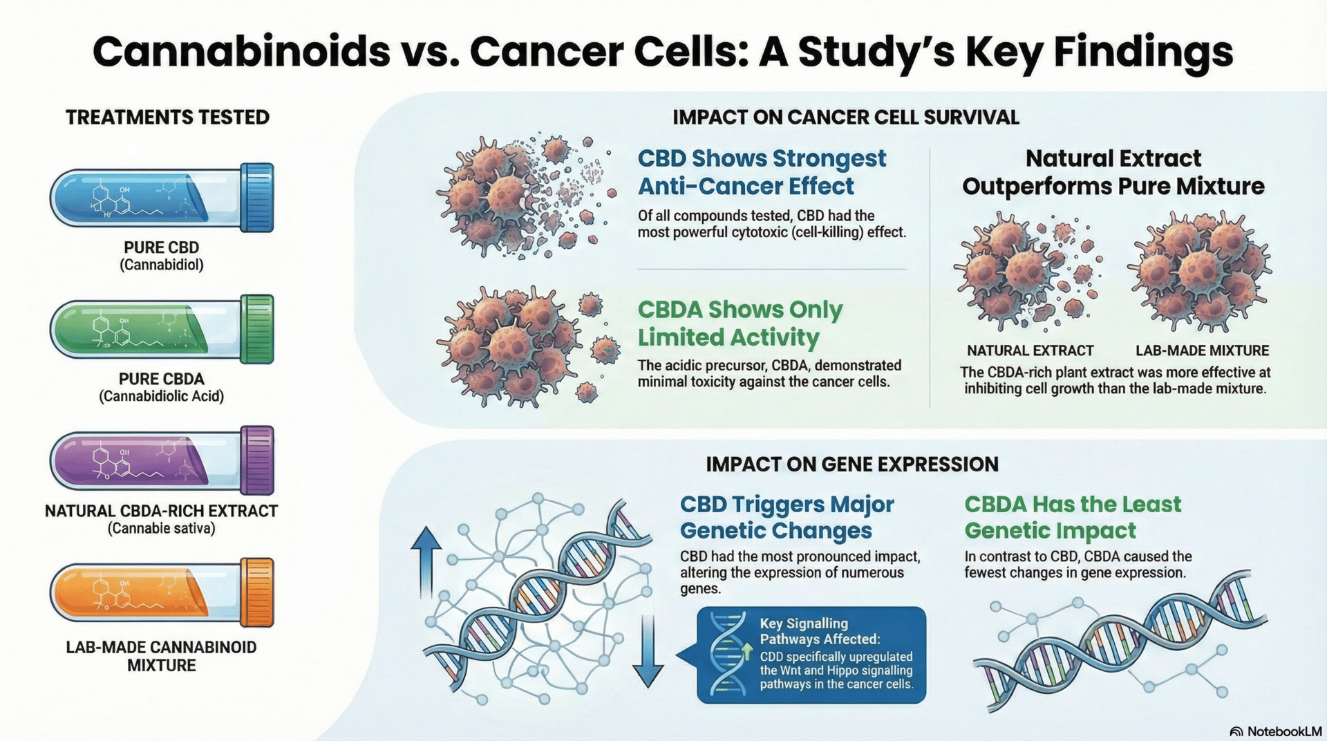 Bottom line / Conclusion: CBD had the strongest overall effects on stopping cancer cell survival and changing gene activity. CBDA alone showed only weak activity. The whole-plant extract rich in CBDA worked better than a simple mixture of pure CBD + CBDA — hinting that the natural combination of compounds in cannabis might be more powerful than isolated ones.The